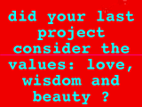 Love, wisdom and beauty manifest themselves in objects and services, but cannot be added onto them. As designers, we want meaningful designs which embody values like love, wisdom and beauty.